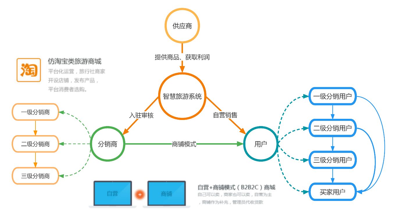 該架構體系改革了傳統(tǒng)旅游的發(fā)展模式,智慧旅游系統(tǒng)是旅游業(yè)專屬的同業(yè)采購與分銷業(yè)務平臺標準化產(chǎn)品,供應商入駐模式,商家獨立管理中心以及平臺傭金結算、售后服務系統(tǒng)等更完善的詮釋了旅游電子商務在現(xiàn)今及未來的發(fā)展模式。支持多供應商店鋪經(jīng)營模式,讓旅行社企業(yè)、旅游聯(lián)盟團體、旅游門戶網(wǎng)站等開展平臺類型電商業(yè)務更加便捷。旅游業(yè)專屬的同業(yè)采購與分銷業(yè)務各項功能從根源上解決了旅游電子商務企業(yè)普遍存在的推廣、招商、盈利等問題。供應商、分銷商與平臺共存模式,極大的豐富了平臺產(chǎn)品,是旅游企業(yè)開展平臺類型旅游電商業(yè)務的最佳選擇。